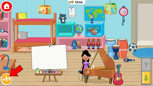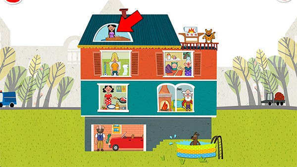 2、进入对应场景后,直接点击相应的物品即可拖动,并且点击左下方的黄色按钮即可让其他房间的角色也来到该场景内