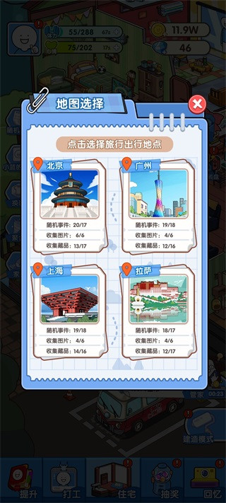游戏提供四个旅游景点,初期只开放第一个景点:北京,后续解锁新地图需要汽车零件和大量金币。