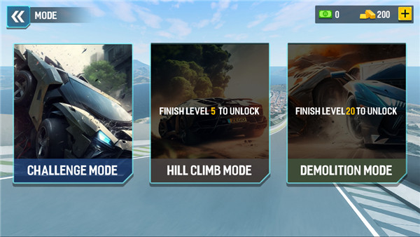 3、返回游戏界面点击PLAY,选择CHALLENGE MODE(挑战模式)、HILL CLIMB MODE(爬山模式)、DEMOLITION MODE(拆除方式)模式;