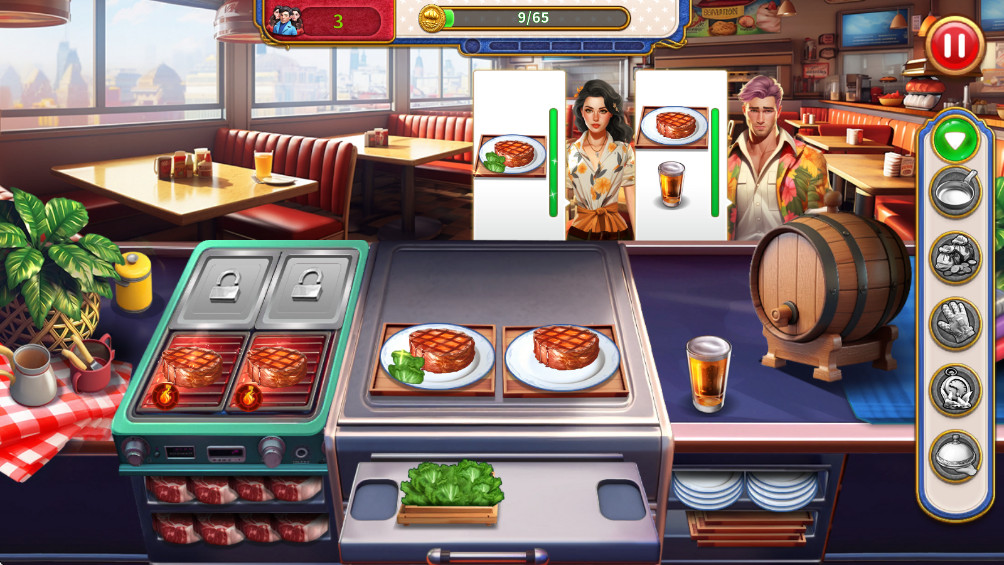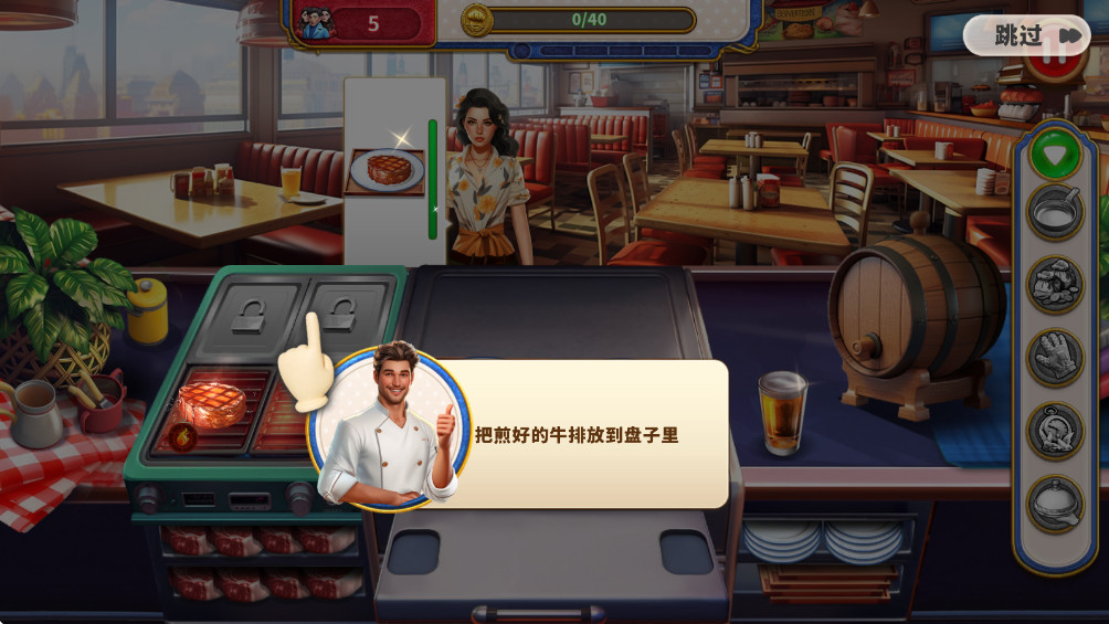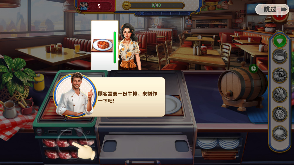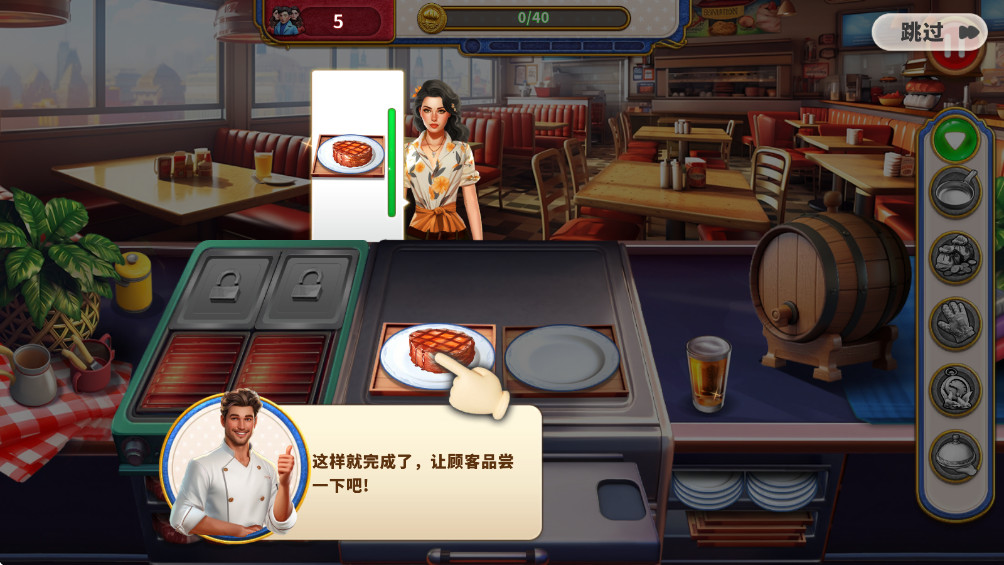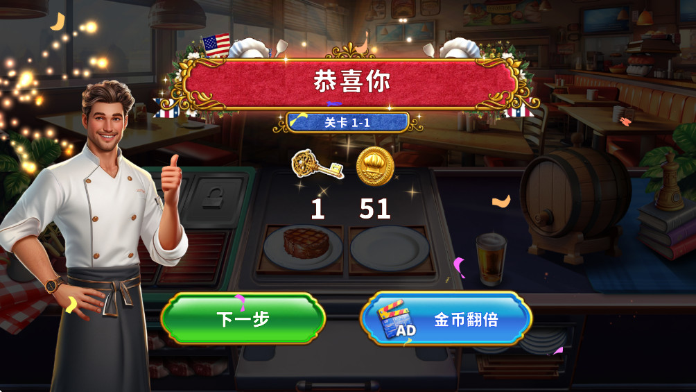 升级厨房:通过赚取金币,升级厨房设备,解锁新的菜谱,提高餐厅的效率。