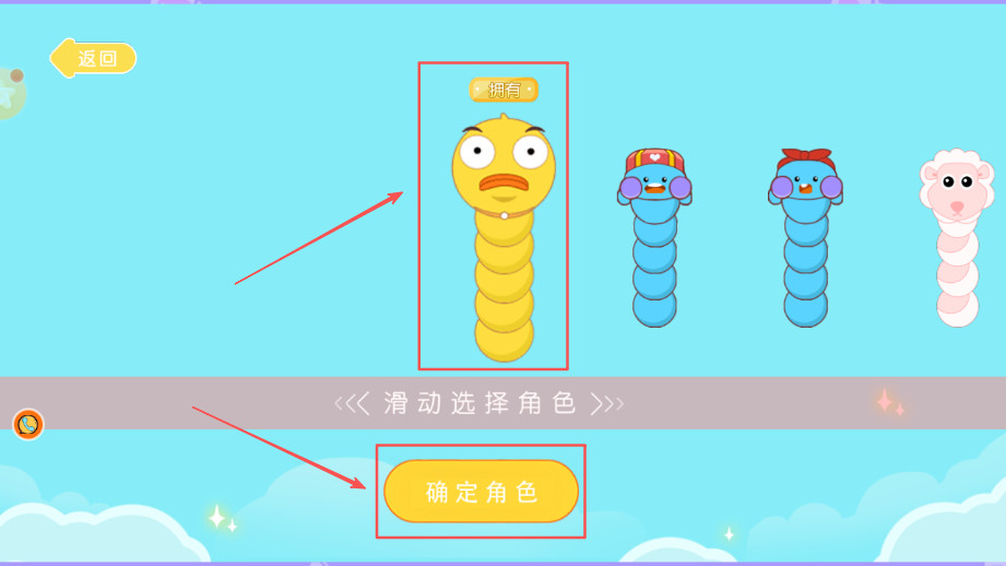 3、选好模式后,会出现不同的贪吃蛇角色供选择,点击选中喜欢的角色,再点击确定角色的按钮,完成角色选择。