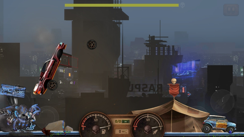 3、当前一辆车不能使用后,可以使用第二辆,先给它加满汽油;然后一直按住右边的按钮往前开撞僵尸;