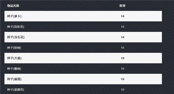 特定种子和材料获取概率 = 其他掉落物概率(13%) * 掉落物等级概率*当前等级出现种子或材料的概率(35%或50%) * (当前种子或材料的权重/种子或材料的权重之和)