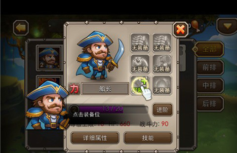 所有初始英雄的品质均为白色,当英雄穿齐全身装备后可以进阶,进阶后的英雄品质将提升为绿色(如图船长头像外框)。每次进阶,英雄都可提升一个品质。