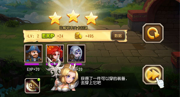 当关卡胜利时获得了装备,当然是第一时间穿上啦!每个英雄可同时最多佩戴6件装备,可提升英雄的属性。