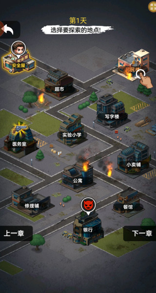 3.进入“第一天求生”任务后,点击【探索】按钮即可外出行动,在废墟中搜集食物与武器,提升战斗力以抵御丧尸袭击。