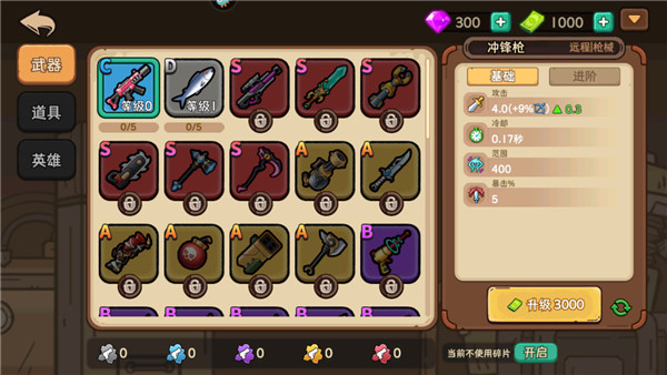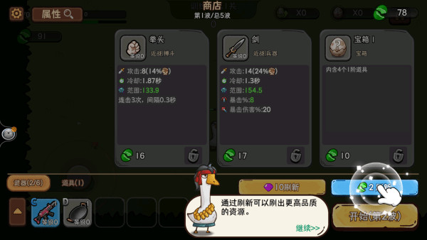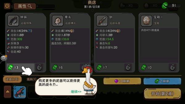 4、当击败每一波敌人或时间消耗完后可以选择武器、道具。