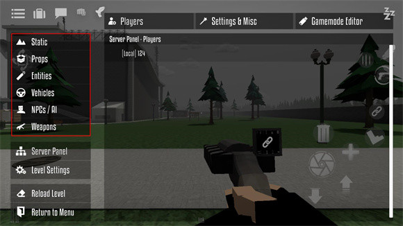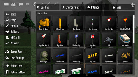 2、然后会出现一个菜单,左边这一栏就是可以添加的道具,分别是建筑、家具、实体物品、车辆、NPC角色、武器。
