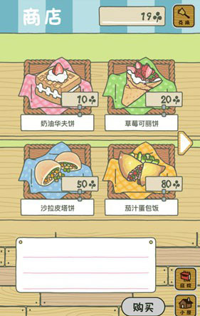 有足够的三叶草后,我们点击屏幕右下角的“商店”按钮,进入商店,可以看到有很多食物便当,用三叶草购买一个便当。由于三叶草数量有限,所以我们第一次只能买第一个10个三叶草的便当。