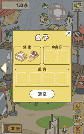在旅行之前,我们要帮它准备旅行所需物品,主要是便当、护身符、道具等三种,当然其中最基础的是食物便当,购买食物需要三叶草才行,我们点击右下角的“庭院”按钮进入庭院。