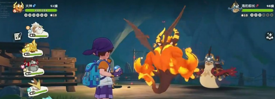 第二只精灵为草系的多菇丁,生命力较强且具备一定反伤机制。此时应切换至罗隐上场,利用其火属性优势形成克制。罗隐不仅输出稳定,技能连贯性也较强,能在多轮交锋中持续施压。尽管多菇丁较为耐打,但在罗隐的高频攻击下仍会逐渐溃败。战斗中注意避免使用草系或水系精灵迎战,以防被反向克制。