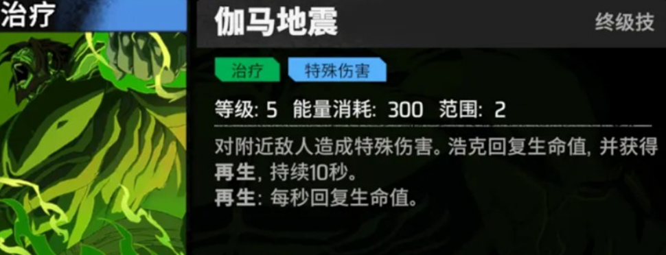 核心生存技能,具备回血与再生双重效果。在技能触发后,浩克不仅能恢复一定比例生命值,还拥有类似“假死复活”的再生机制。当生命值降至临界点时,再生效果可让他重新站起来继续作战。这一机制极大提升了他在高难度关卡或BOSS战中的容错率,也让队伍整体续航能力得到增强。