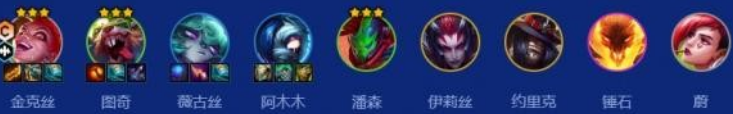 1、开局金克丝和蔚的数量多可玩,在4-5人口可以拿金克丝天选定阵容,前期可以用2舞者2朋克2枪手过度。