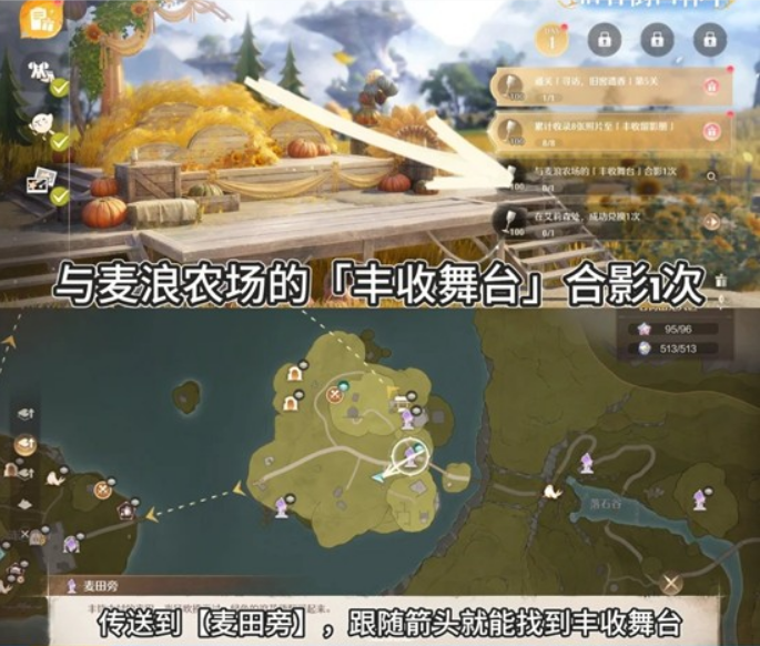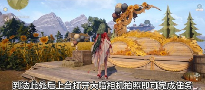 传送到【麦田旁】,跟随箭头走到蓝色三角指向处就是丰收舞台,登上舞台后打开大喵相机拍照即可完成任务