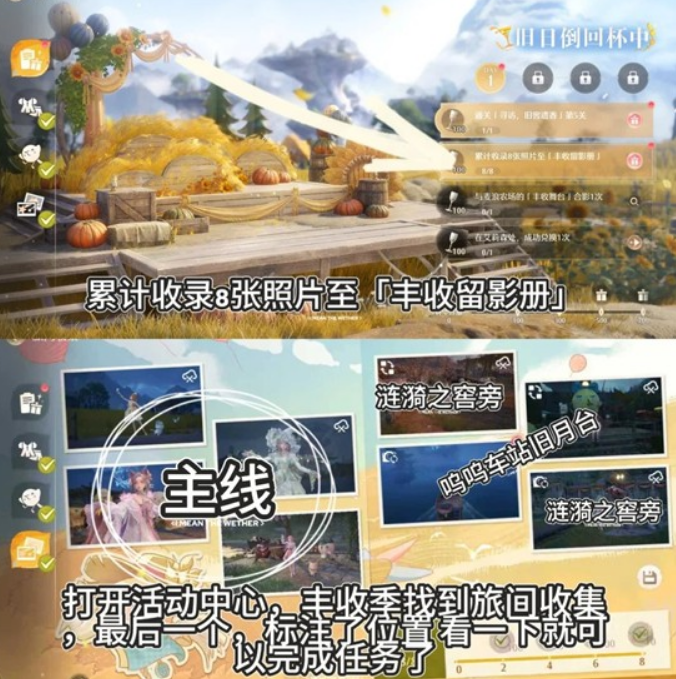 打开活动中心,丰收季找到旅间收集,最后一个,我标注了拍照需要传送到的位置,看一下任务介绍就可以知道了