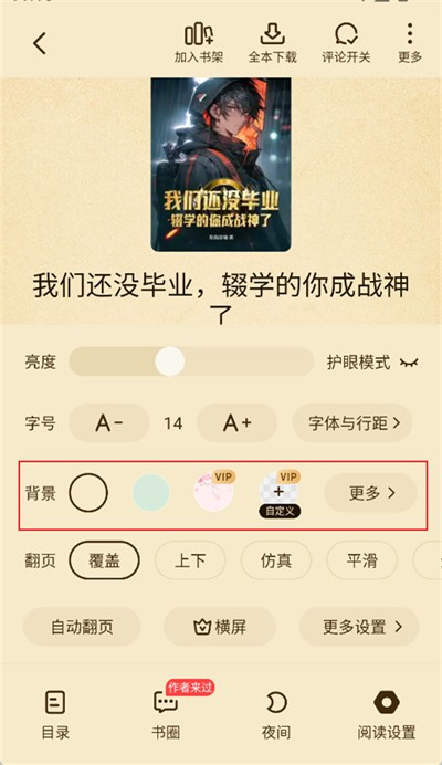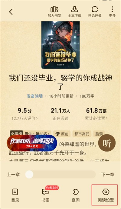进入小说阅读界面后,点击界面中央的位置,点击后会弹出更多的选项,点击下方的【阅读设置】选项;