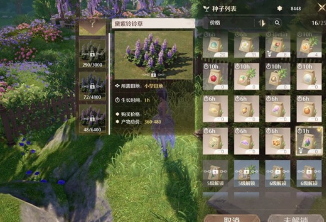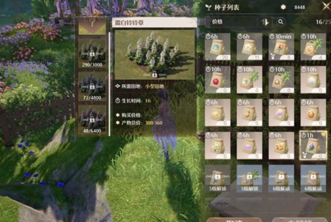 在种植能力达到四级后,解锁玲玲草跟滋养甘露,玲玲草价格二百,生长时间一小时,滋养甘露价格一百,减速一小时,白色收支持平,只要刷到蓝色跟紫色就赚了