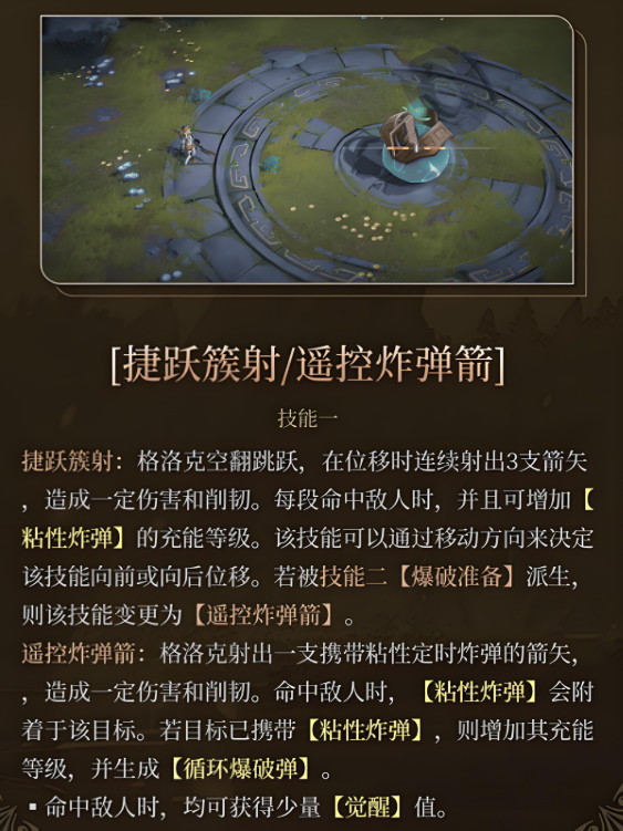 三技能“诱爆箭”可在短时间内快速射出4支箭矢,造成多段伤害与削韧效果。该技能在命中时会触发目标身上的粘性炸弹,并额外获取少量觉醒值,进一步加快能量循环速度。