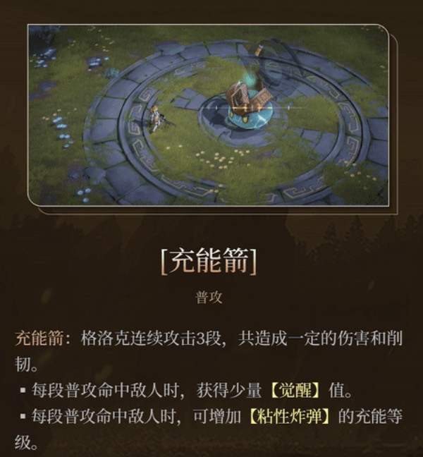 她的普通攻击“充能箭”为三段式打击,每段命中均可削减敌方韧性,并为自身积累觉醒值。同时,每次攻击还能提升粘性炸弹的等级,使其在后续爆发中更具威力,是构建完整输出循环的重要起点。