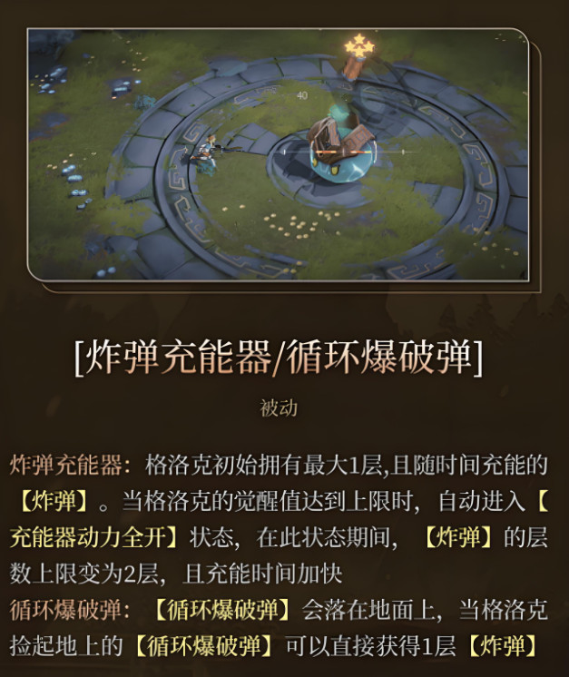 格洛克具备两个核心被动:“炸弹充能器”和“循环爆破弹”。前者初始拥有1层充能,当觉醒值满时进入加速状态,显著提高充能效率;后者则允许她在爆破弹落地后拾取并立即获得1层炸弹充能,实现资源的高效再利用,形成稳定的技能衔接链。