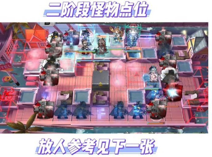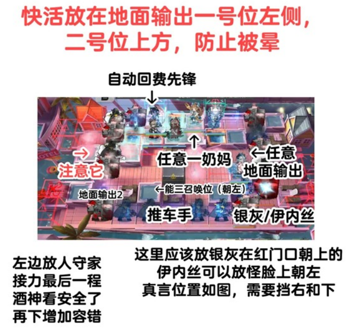 休整阶段下先锋,下真言在右下高台朝下/银灰在右下地面朝上/伊内丝影哨在右下朝左,总之照得出右下隐身怪的安排都行。非游走没初动需要暖机真银技能,放快活给他们挡晕。0反隐就快活吸引攻击打怪。