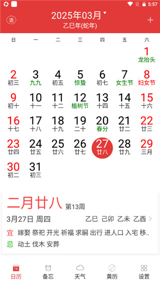 万年历黄历日历手机版app是简洁实用的日历工具,界面清爽无广告,查日历更舒适。除了基础日历功能,还内置专业黄历,清晰展示每日宜忌、吉凶信息,即使不懂黄历也能轻松看懂。万年历黄历日历手机版官方版安卓版还提供权威天气预报,实时更新未来两周天气,帮助用户提前做好出行准备。无论查日子还是看天气,万年历黄历都是生活中的贴心助手。