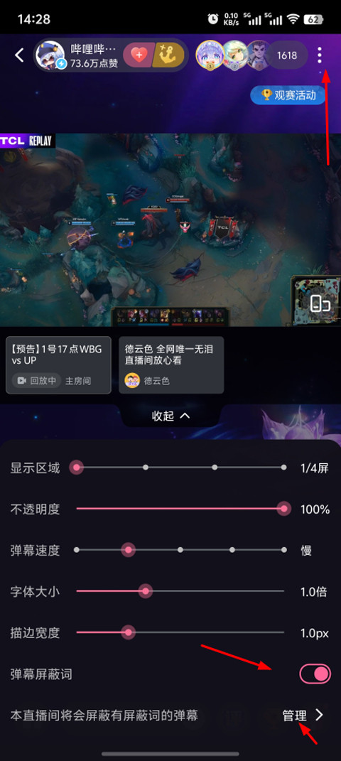 2、进入后点击右上角三个点,接着开启弹幕屏蔽词,然后点击管理;