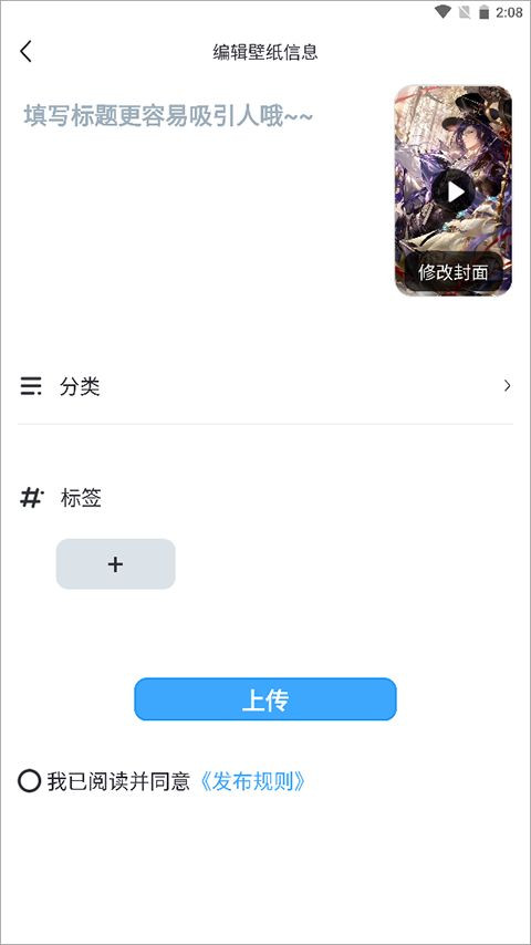 3、然后选择好自己的动态壁纸,接着为其提供撰写好标签,名字等信息,点击【发布】即可。