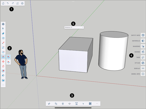 1)主页/保存:选择此图标可退出您的文档并返回 SketchUp 的主屏幕。在您返回主屏幕的路上,SketchUp 会询问您是否要保存或放弃您对模型所做的任何更改。2)撤消和重做:我们都会犯错误。我们有时也只是想尝试和探索不同的选择。这些突出显示的图标将删除您的最新更改或将其恢复。