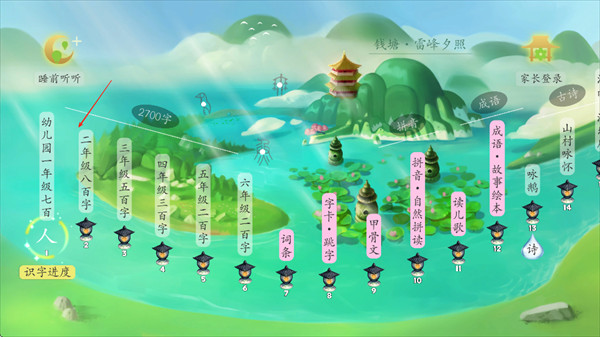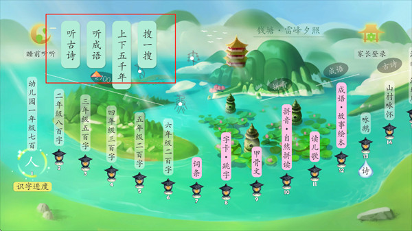 1、识字模块功能,大量的古诗、汉字让孩子进行学习;