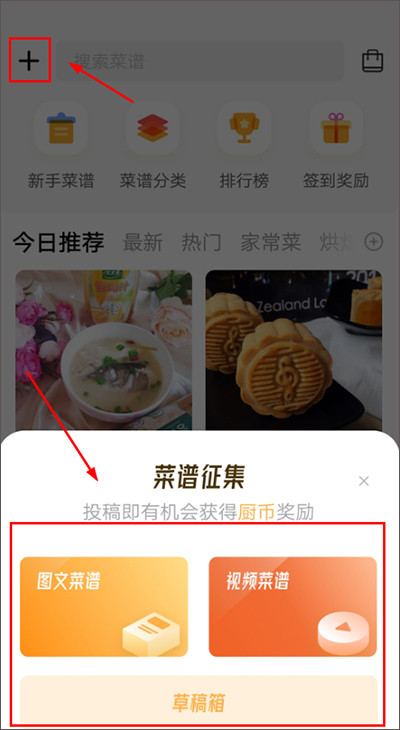 1、下载打开网上厨房,点击首页左上方【+】,选择发布菜谱的方式:图文菜谱或是视频菜谱的方式来发布;