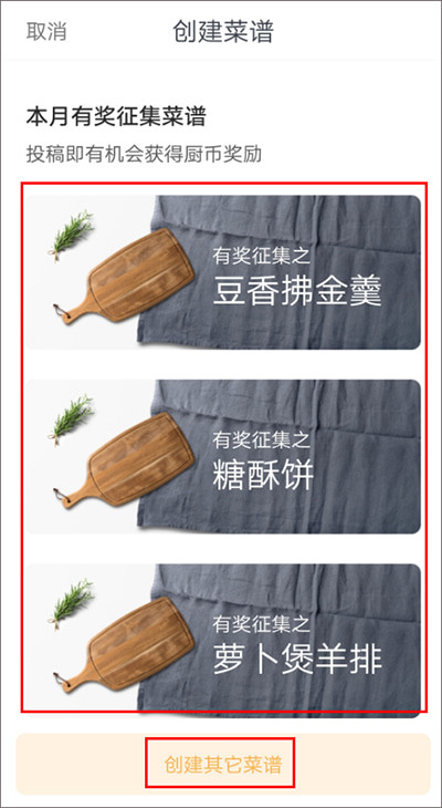 2、用户可参加软件内的有奖征集菜谱,这样可获得厨币,厨币可用于在软件商城内兑换各种商品;除了参加有奖征集菜谱,用户也可以自行创建其他菜谱来获取厨币哦!