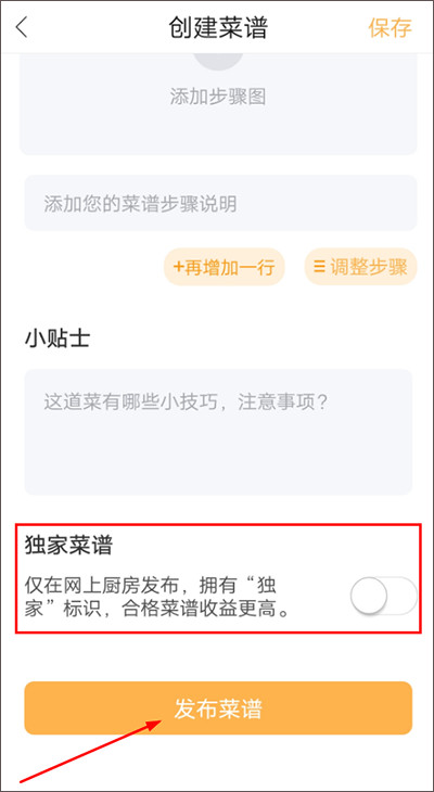 3、将菜谱制作步骤,图片,材料等信息填写在【创建菜谱】页面内,填写完成后。可在这里选择:点击【发布菜谱】即可可在这里选择【独家菜谱】仅在网上厨房发布,拥有“独家”标识,合格菜谱收益更高。之后点击【发布菜谱】即可。