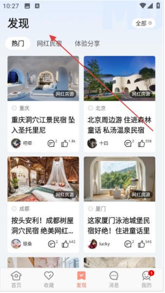 2、在底部导航栏点击发现,进入发现页面,浏览热门板块的民宿推荐,找到感兴趣的重庆洞穴江景民宿内容。