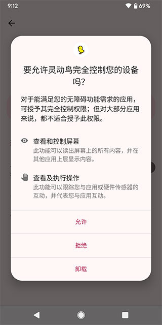 2、为防止弹窗信息被状态栏覆盖,之后点击下方的无障碍未开启按钮,跳转自无障碍界面中,并授予灵动鸟无障碍权限;