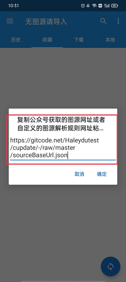 1、同样还是打开app,这时会弹出一个复制公众号……等等提示,将第三方图源网址复制到这里。