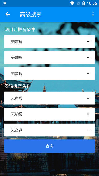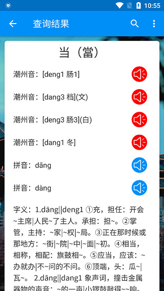 3、支持多词查询,可根据潮州拼音、汉语拼音、汉字偏旁、汉字笔画数等条件进行查询。普通话和潮州方言都有发音功能