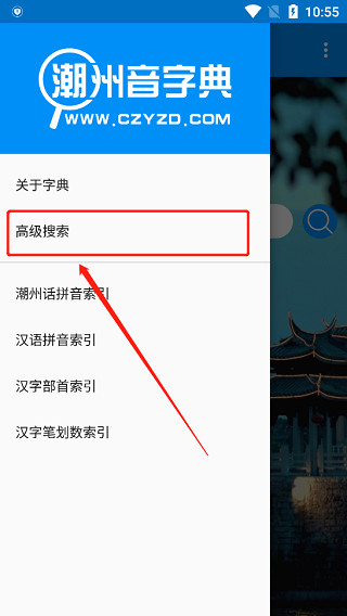 3、点击左上角,这里还支持高级搜索、潮州话拼音索引、汉语拼音索引、汉字部首索引、汉字笔划数索引等多种功能。