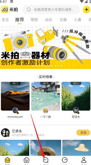 1、打开米拍摄影APP,进入到用户界面,点击页面下方的创作按钮;