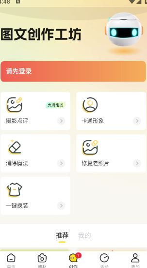 2、在创作页面中可以看到有摄影点评、修复老照片等选项,选择自己需要的点击进入,这里以修复老照片举例;