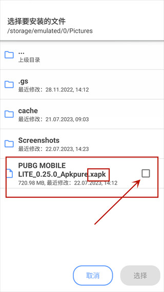 4、进入文件选择界面,搜索或者点击需要安装的文件,小编这里以pubg为例,可以看到这里有一个后缀为xapk的安装包