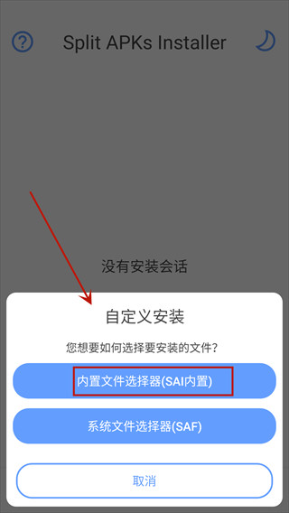3、弹出安装提示,包括内置文件选择器(SAI内置)和系统文件选择器(SAF),用户可根据需求选择使用,这里以系统文件选择器(SAI内置)为例