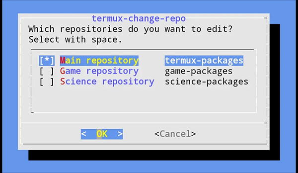这里以换成清华大学开源软件镜像为例,在 Termux 中执行命令 termux-change-repo 进入图形界面如下图。