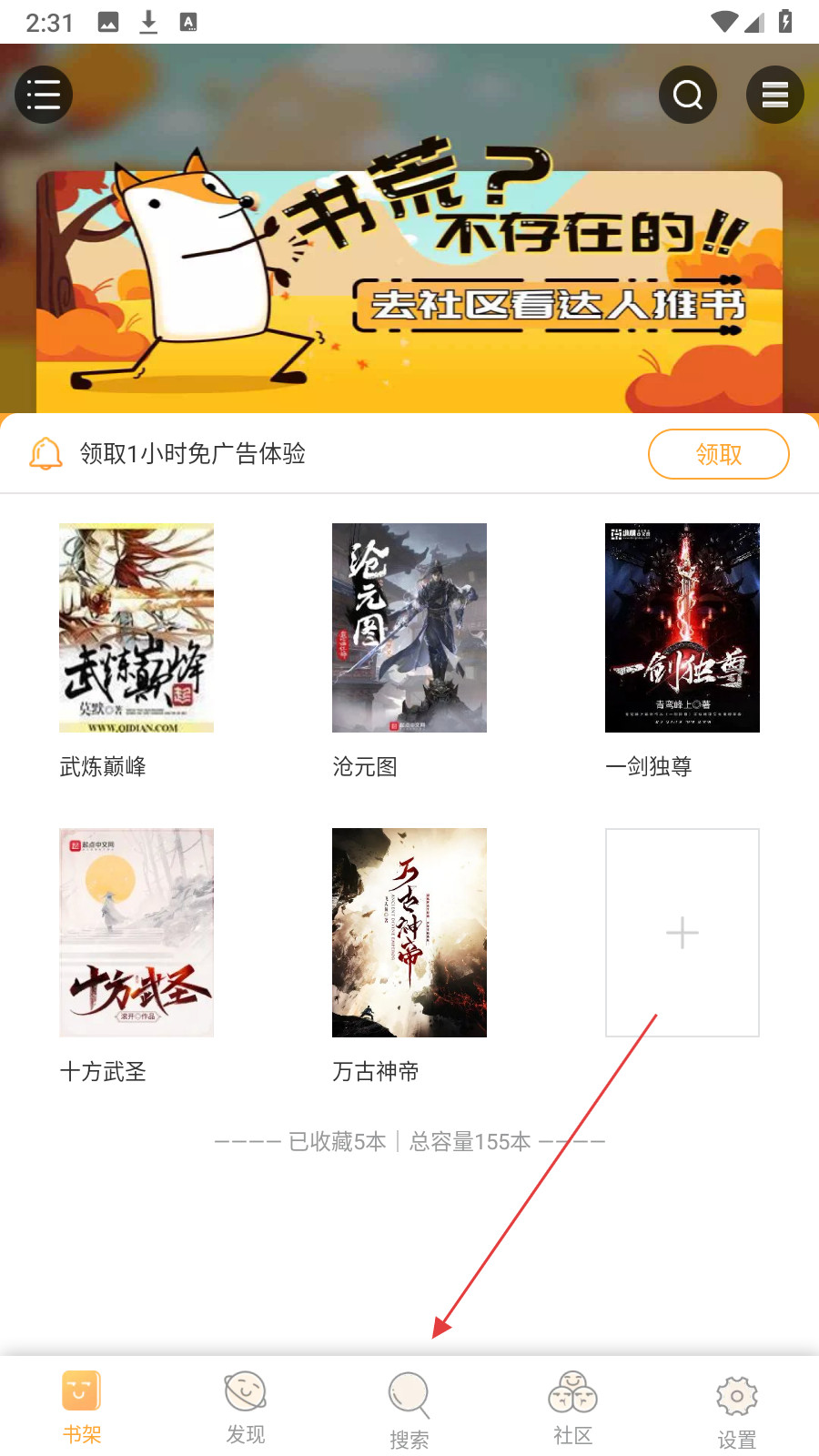 1、在书架页面,点击底部【搜索】图标,进入搜索页面。