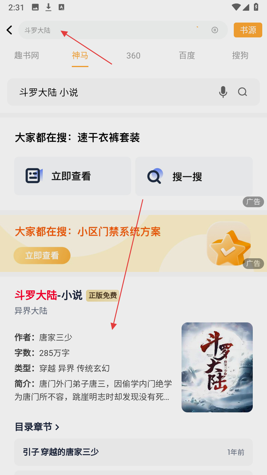 3、输入完成后,在搜索结果中【找到对应的小说】。