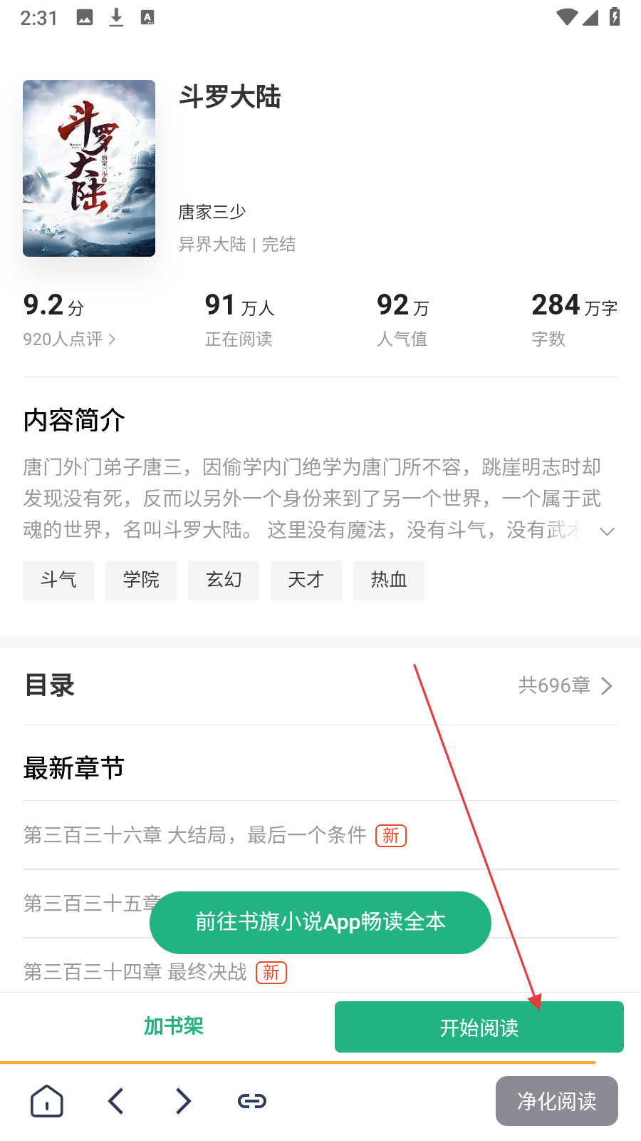 4、点击小说进入详情页,再点击【开始阅读】按钮,即可开始阅读小说。