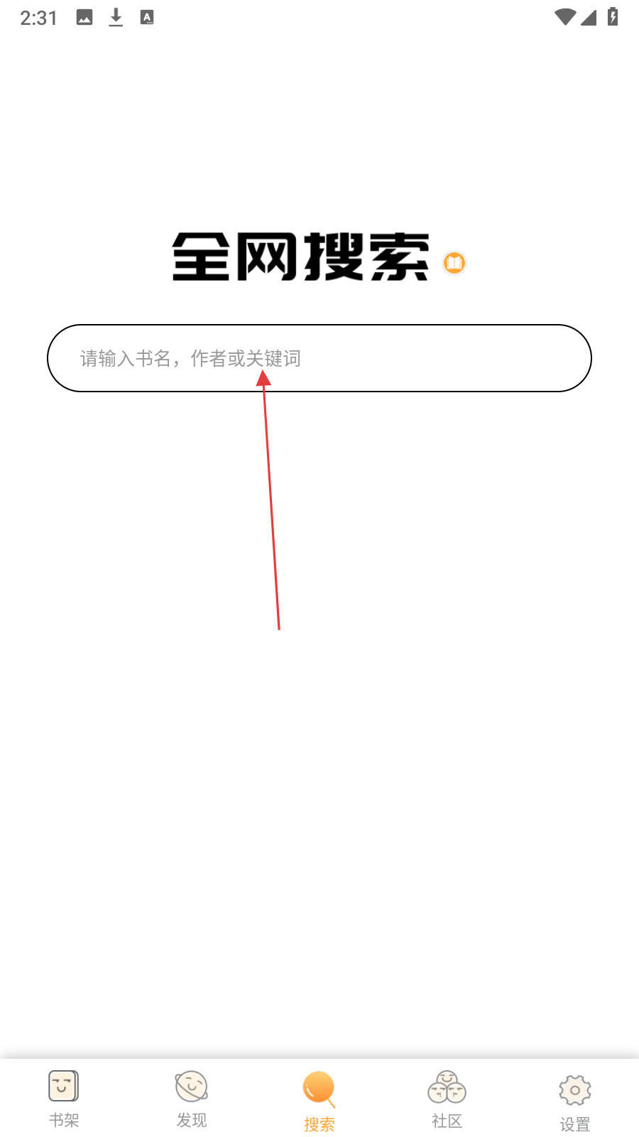 2、在搜索页面的输入框中,输入【想要查找的书名、作者或关键词】。